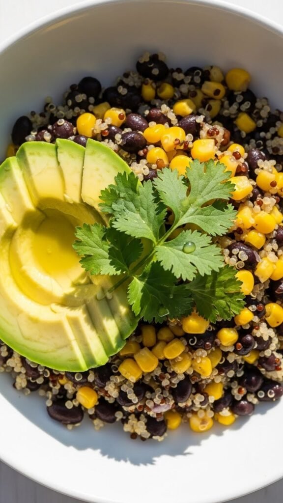 - Mix quinoa, black beans, corn, and avocado in a bowl.