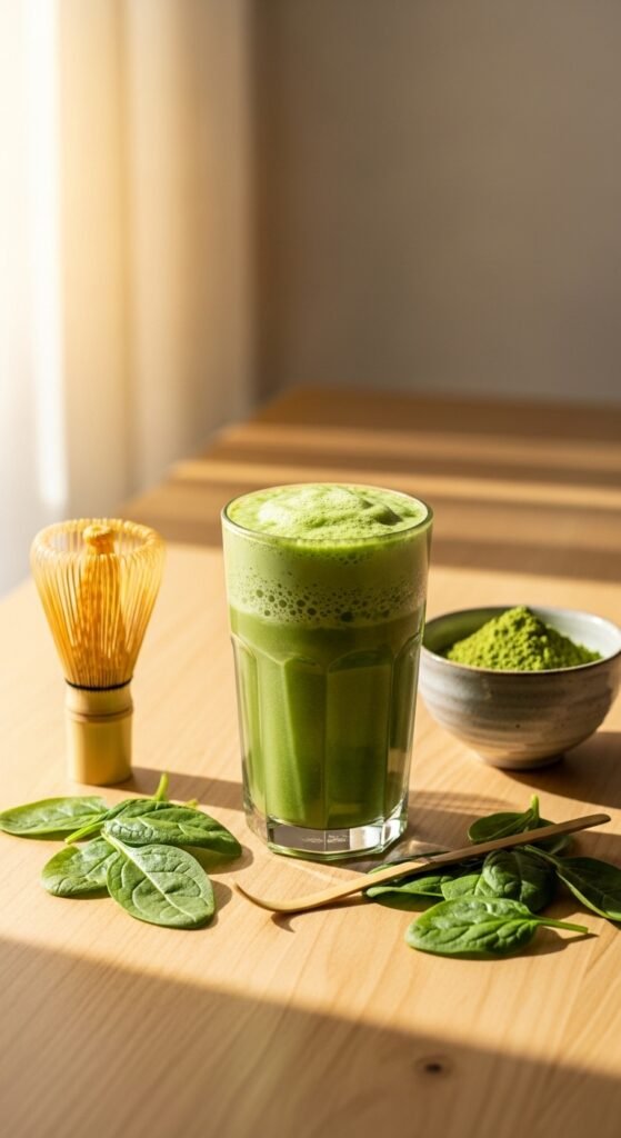 - Combine matcha, banana, spinach, and almond milk in blender.