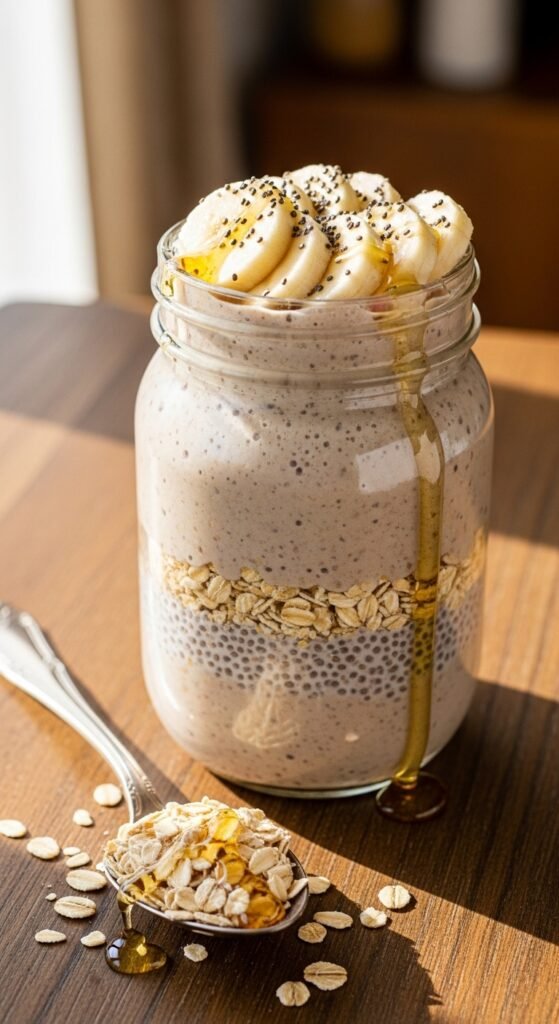 - Soak oats and chia seeds in almond milk overnight.