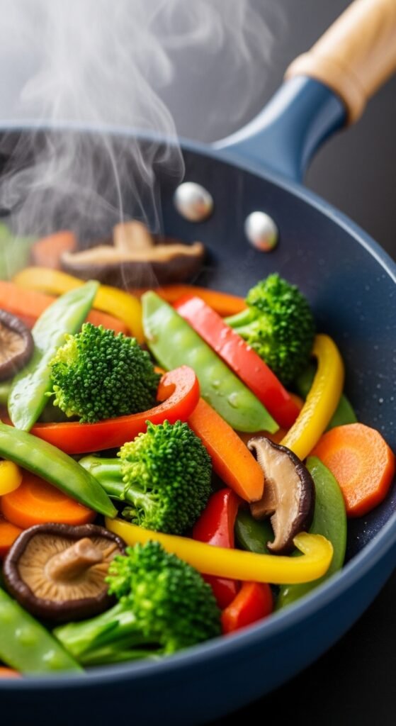 - Add vegetables and sauté 5–6 minutes.