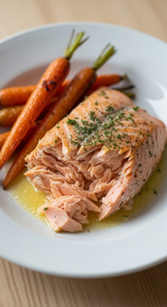 6. Baked Salmon Flakes with Roasted Carrots