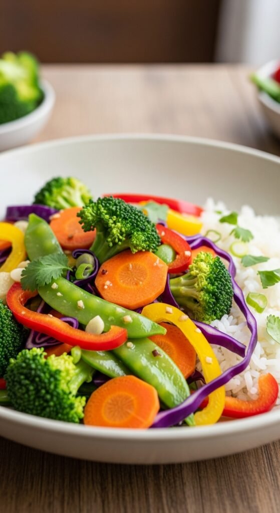 5. Clean Eating Veggie Stir-Fry with Rice (Simple & Mild)