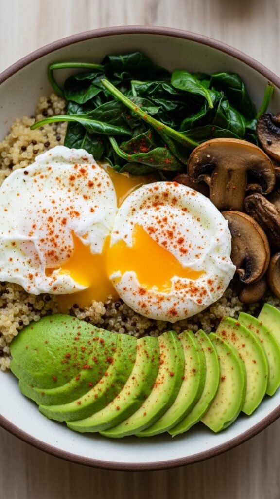 Why it’s great: Quinoa is a complete protein, making this bowl a powerhouse breakfast. Combined with eggs and veggies, it’s a balanced meal that’s as satisfying as it is nourishing.