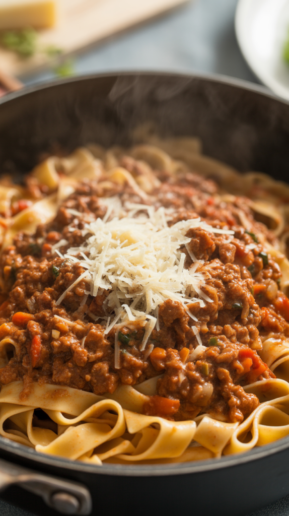 Bolognese ragù is a meat-forward Italian sauce made with ground beef (sometimes pork), finely chopped vegetables, tomato, wine, and milk. It’s traditionally served with tagliatelle, not spaghetti, because the wide pasta holds the thick sauce better.