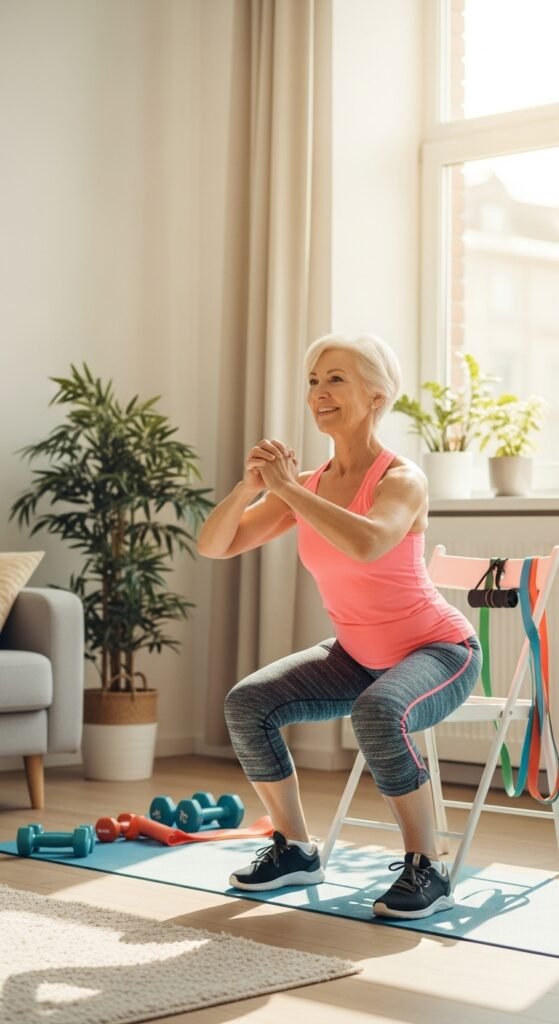 Here’s a simple home workout plan for women over 50 incorporating key fitness for women over 40 exercises that target all major muscle groups. Aim to do this routine 3–4 times a week.