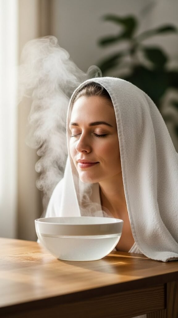 Lean over a bowl of hot water for 5–8 minutes (keep distance), then cleanse or apply a clay mask.