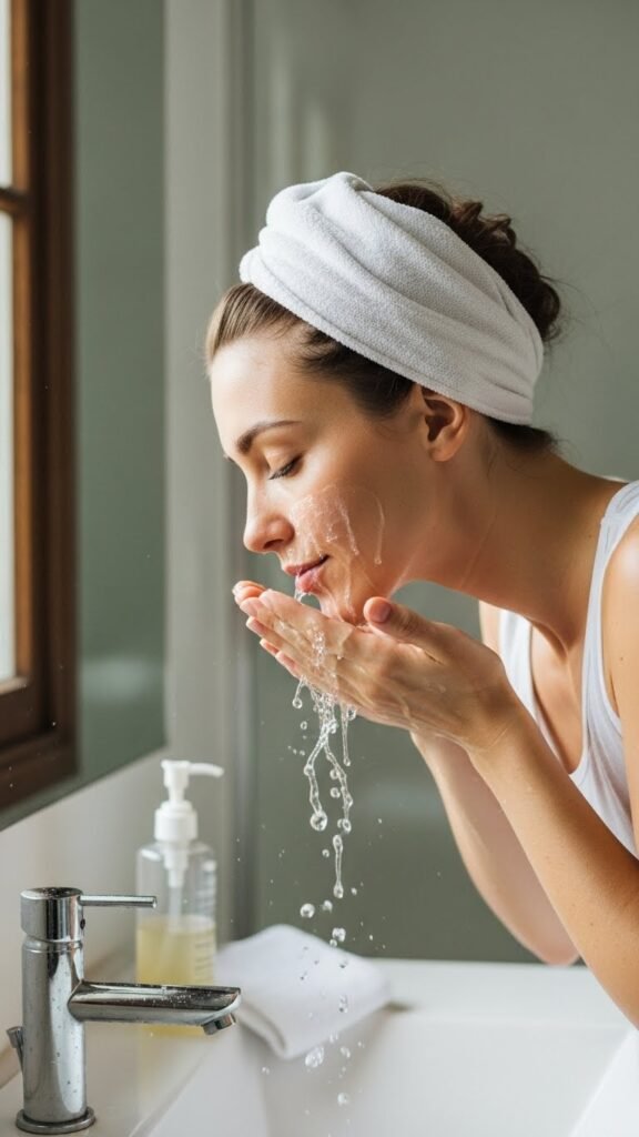 Use lukewarm water and massage cleanser for 30–60 seconds, especially around the nose and chin.