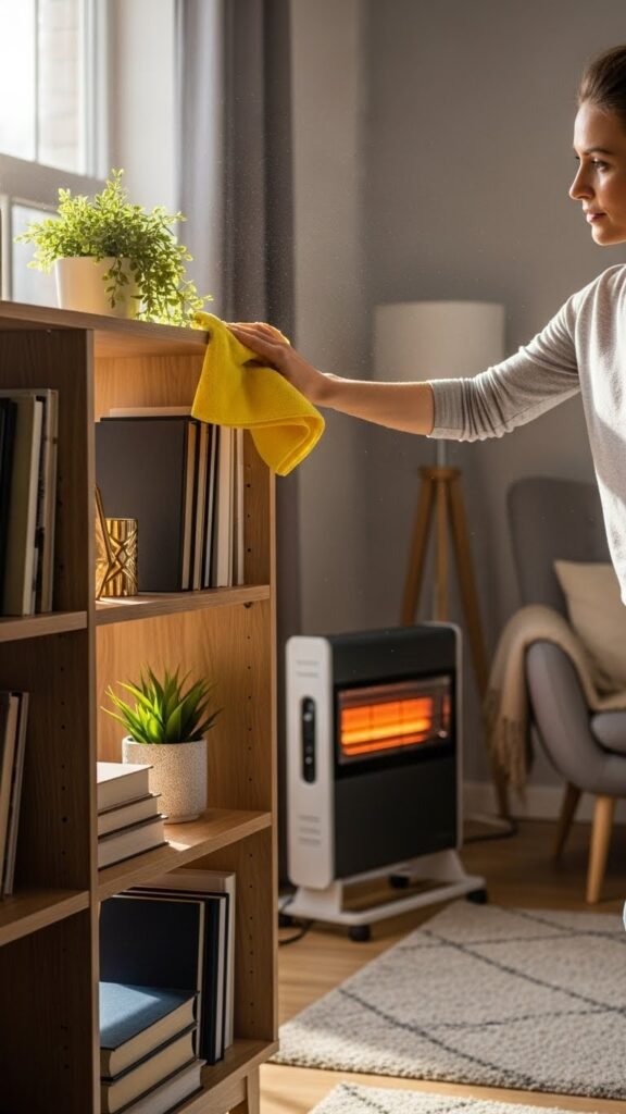 It’s compact, quiet, and perfect for bedrooms especially during winter when the heater spreads dust around.